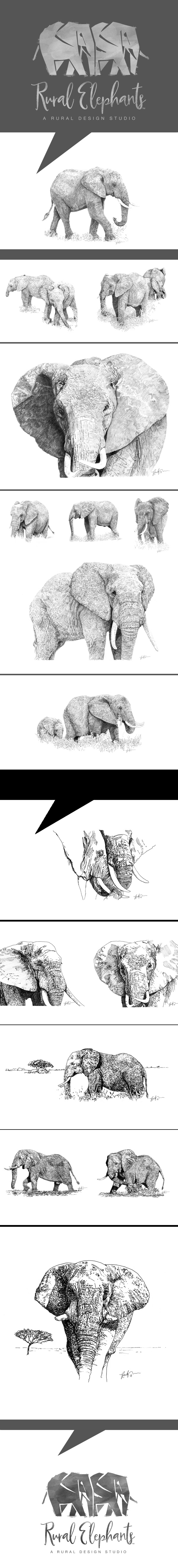 Elephant drawings and illustrations. Pencil, pen and ink.